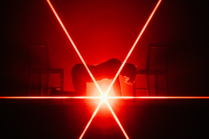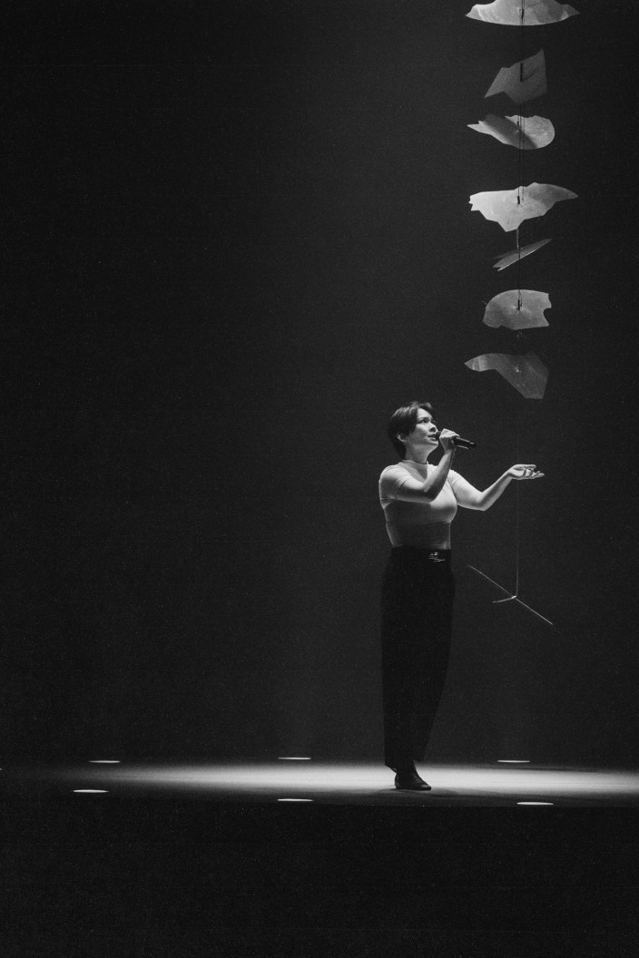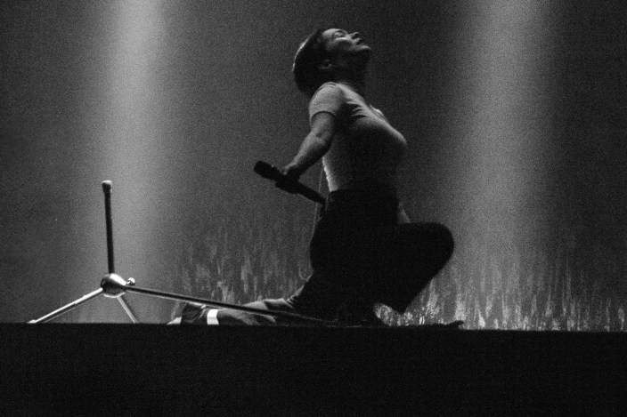 And then there’s the prescient substance of our interview, particularly the part about being her own island. That’s precisely what she is in The Land — dressed simply in black slacks and white top, she moves about a starkly decorated stage alone, with members of her excellent seven-piece band situated on the outer edges. On film, director Grant James takes a cue from Andi Watson’s minimalist stage design by emphasizing Mitski’s singularity, framing her at a remove from the audience and her fellow musicians. She is, in almost every shot, holding all our attention; When James cuts to the band, he keeps her out of the frame. Otherwise, Mitski’s most prominent on-screen co-stars are the two chairs she deploys as props at center stage.