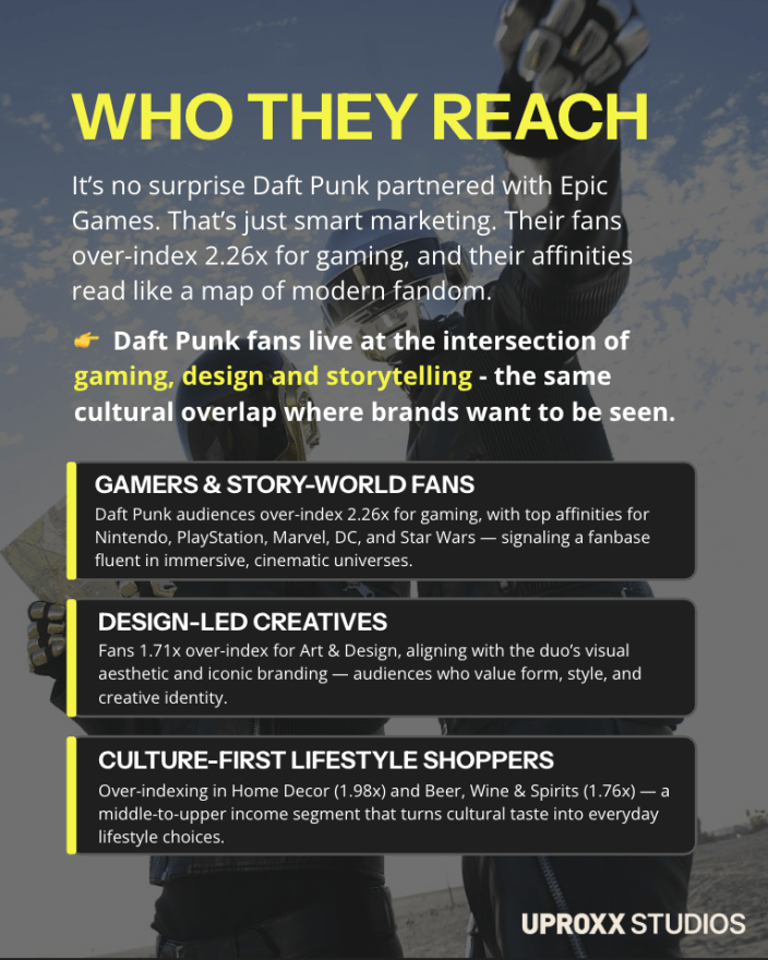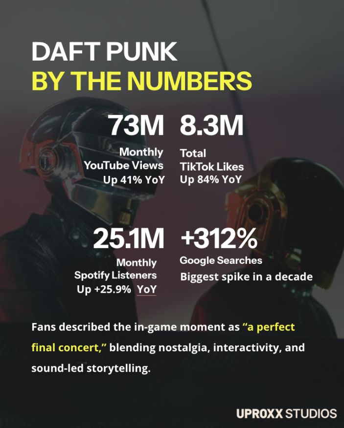 And for brands, it was proof that music’s storytelling power can still move entire generations. Within days, their influence surged. Their monthly Spotify listeners jumped 25.9 percent to reach 25.1 million listeners, while their 73 million added views on YouTube represented a 41 percent increase. TikTok likes for the duo spiked 84 percent, giving them a total of 8.3 million. But, perhaps most tellingly, Google searches for “Daft Punk” skyrocketed by 312 percent — the biggest increase in a decade.
