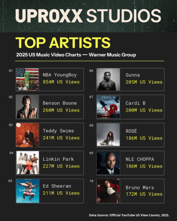 As we continue to unpack year-end YouTube data around Warner Music Group artists (who UPROXX exclusively represent in deals for channel sponsorships), we wanted to take a look at the top-performing artists and explore the narratives that help explain their dominance.