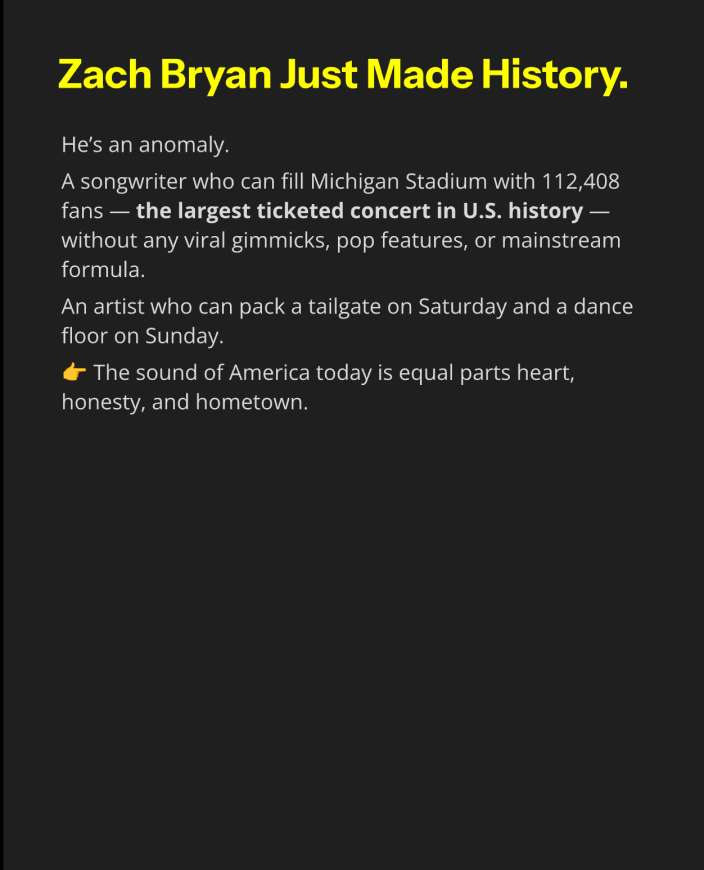 On September 27, 2025, country crooner Zach Bryan attracted 112,408 fans to Michigan Stadium — the largest ticketed concert in US history. The concert was the culmination of a seven-year climb that saw Bryan go from uploading music to YouTube between his duties as a member of the United States Navy to Billboard Hot 100 No. 1 hits, Grammy Award wins, and over 30 million albums and singles sold.