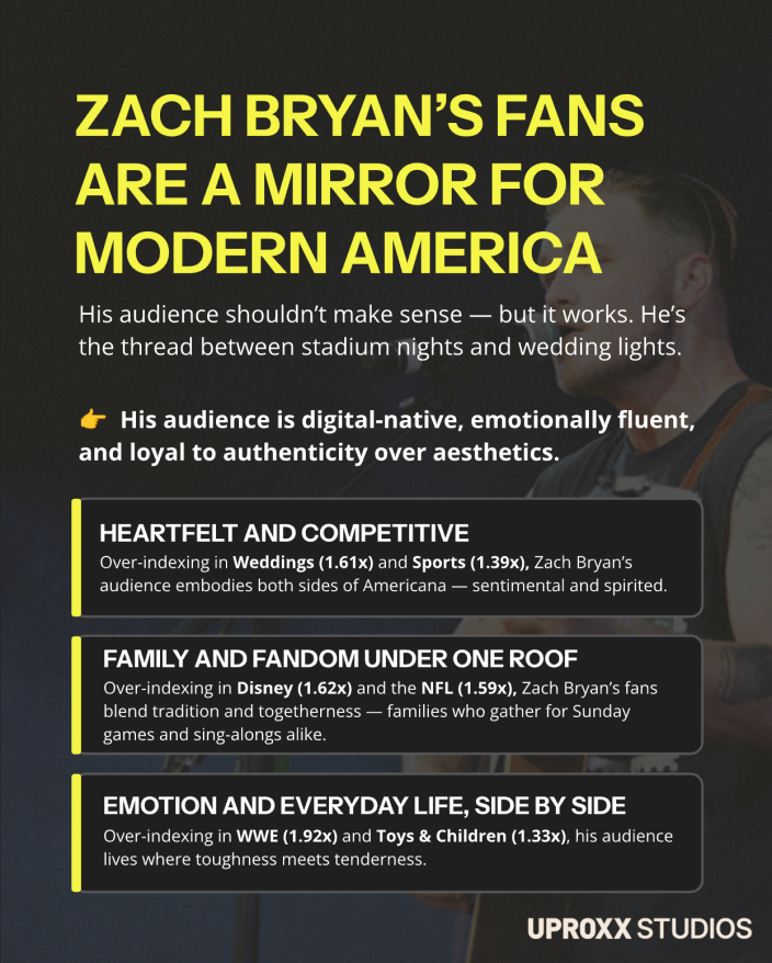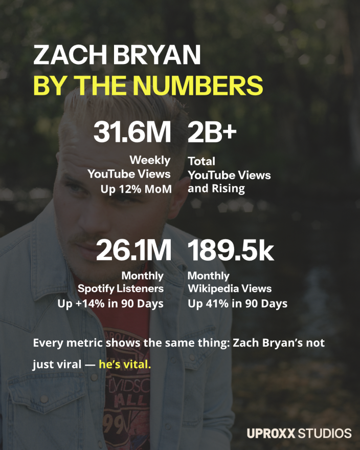 In just the past 90 days, Bryan’s digital footprint has hit impressive milestones, including over 2 billion total YouTube views, 31.6 million weekly YouTube views (up 12% in that timeframe), and 26 million monthly listeners on Spotify (up 14% in that timeframe). Meanwhile, interest in the “I Remember Everything” singer steadily grows; over the same three-month span, views of his Wikipedia article grew over 41%, reaching over 189,500 views.