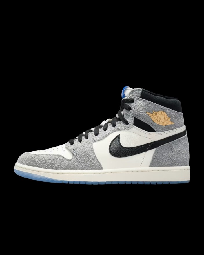 This AJ-1 sports an exquisite colorway that combines grey, white, and black across the upper with hints of blue at the tongue tag and outsole. Am I the only one who looks at this colorway and sees a storm cloud? Amazing colorway aside, this sneaker also features a premium leather and suede upper with a padded ankle collar and a metallic gold logo at the ankle.